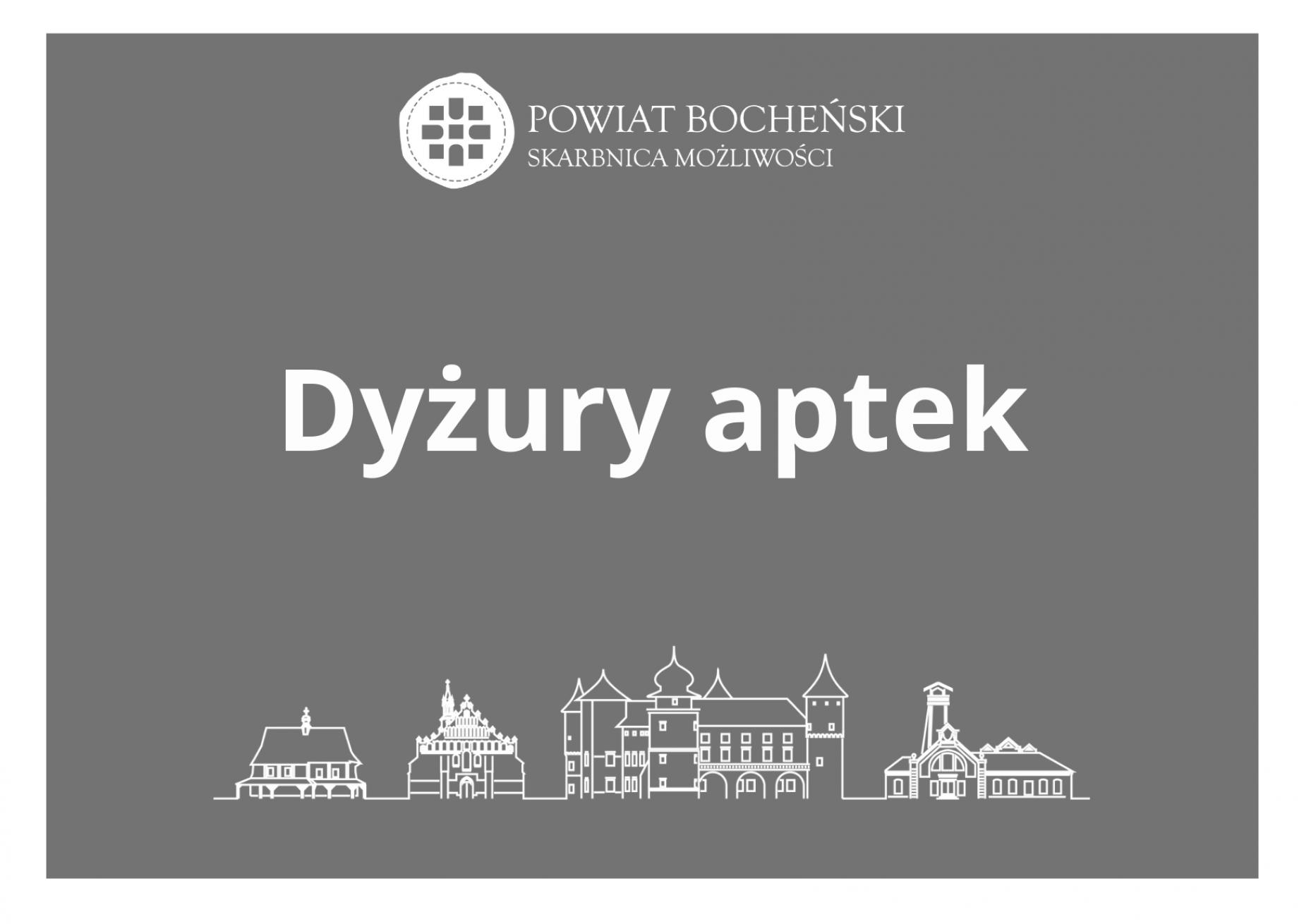 Ustalono, iż na terenie powiatu bocheńskiego w dni robocze (poniedziałek - piątek) apteki jednozmianowe pracować będą w godzinach 8:00 - 16:00, dwuzmianowe w godzinach 8:00 – 20:00. W soboty jednozmianowe w godzinach 8:00 – 14:00 w co drugą sobotę, dwuzmianowe w godzinach 8:00 – 14:00 w każdą sobotę. W dniach zwyczajowo przedświątecznych tj. Wigilia, Sylwester, Wielka Sobota apteki jedno i dwuzmianowe w godzinach 8:00 – 14:00.