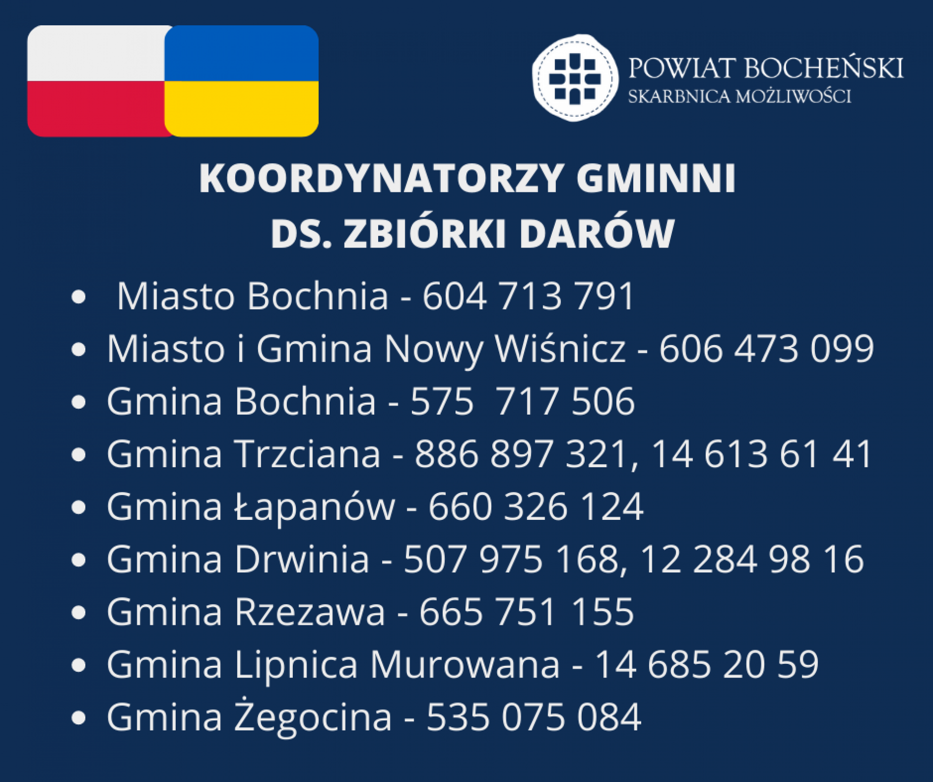 Na terenie powiatu bocheńskiego, aktualnie trwa kilkadziesiąt zbiórek pomocowych dla uchodźców wojennych z Ukrainy. Każdy z Organizatorów tych zbiórek powinien skontaktować się z koordynatorem gminnymi w celu odpowiedniego przygotowania i przekazania zebranych materiałów. Apelujemy do osób indywidualnych, które rozpoczęły zbiórki, aby dołączali w miarę możliwości do wcześniej uruchomionych zbiórek, co z pewnością usprawni proces przekazywania darów.