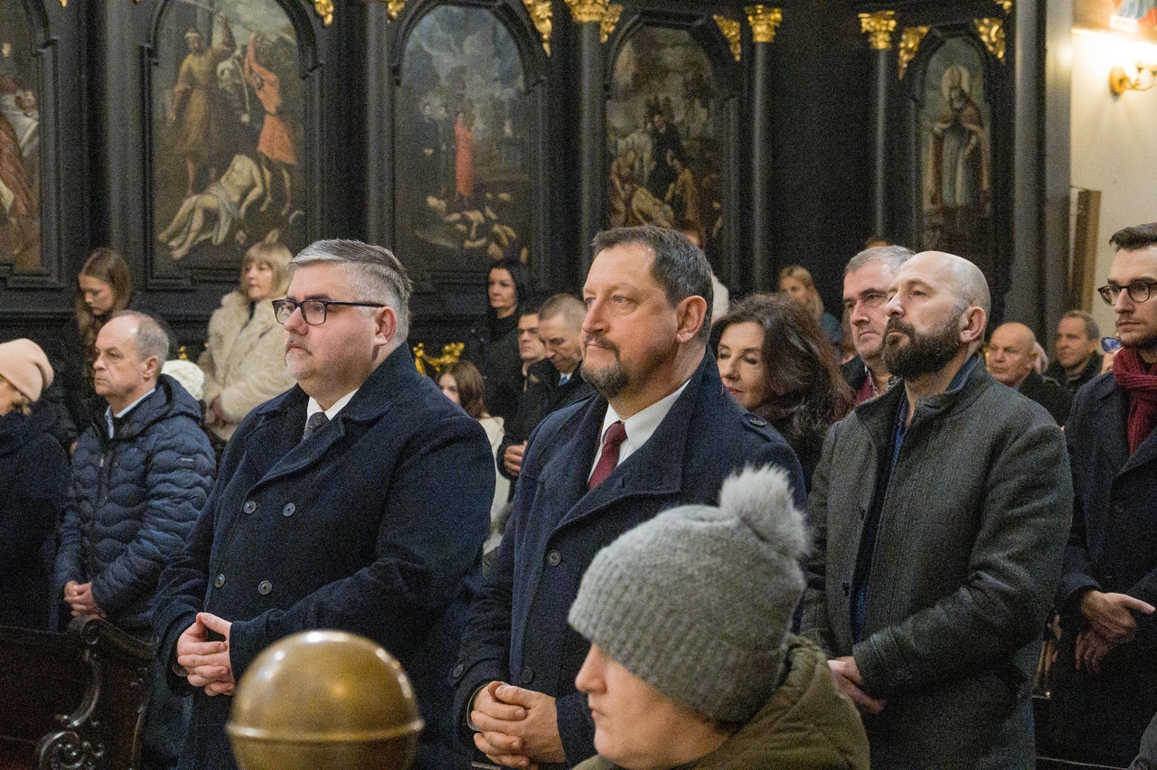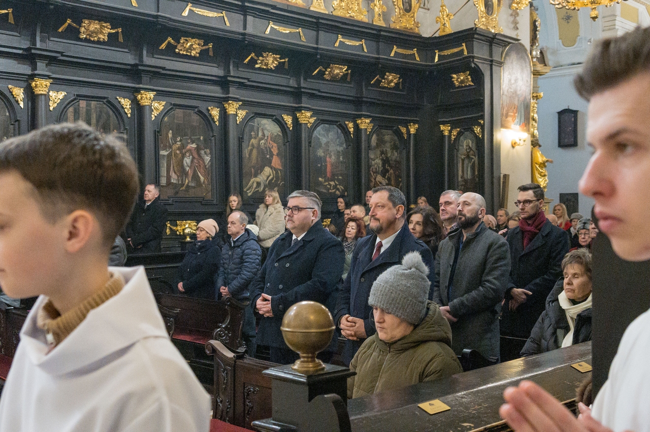 16.02.2026Podczas homilii ks. Krzysztof Iwanicki nawiązał do tragicznych wydarzeń rzezi galicyjskiej oraz wspomniał o historii największego żyrandola w bazylice, który do bocheńskiego kościoła trafił z Wiednia. Został ufundowany 1848 roku przez rodziny szlacheckie jako wotum wdzięczności za ocalenie z rzezi.