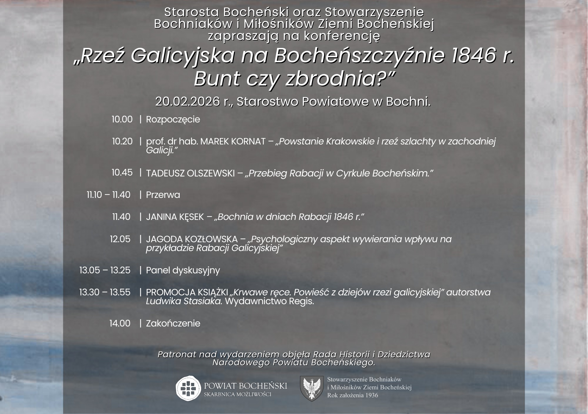 Na koniec serdecznie zapraszamy do udziału w konferencji pt. „Rzeź Galicyjska na Bocheńszczyźnie 1846 r. Bunt czy zbrodnia?”, która odbędzie się w piątek, 20 lutego, w sali narad Starostwa Powiatowego w Bochni, w związku z 180. rocznicą rabacji galicyjskiej.