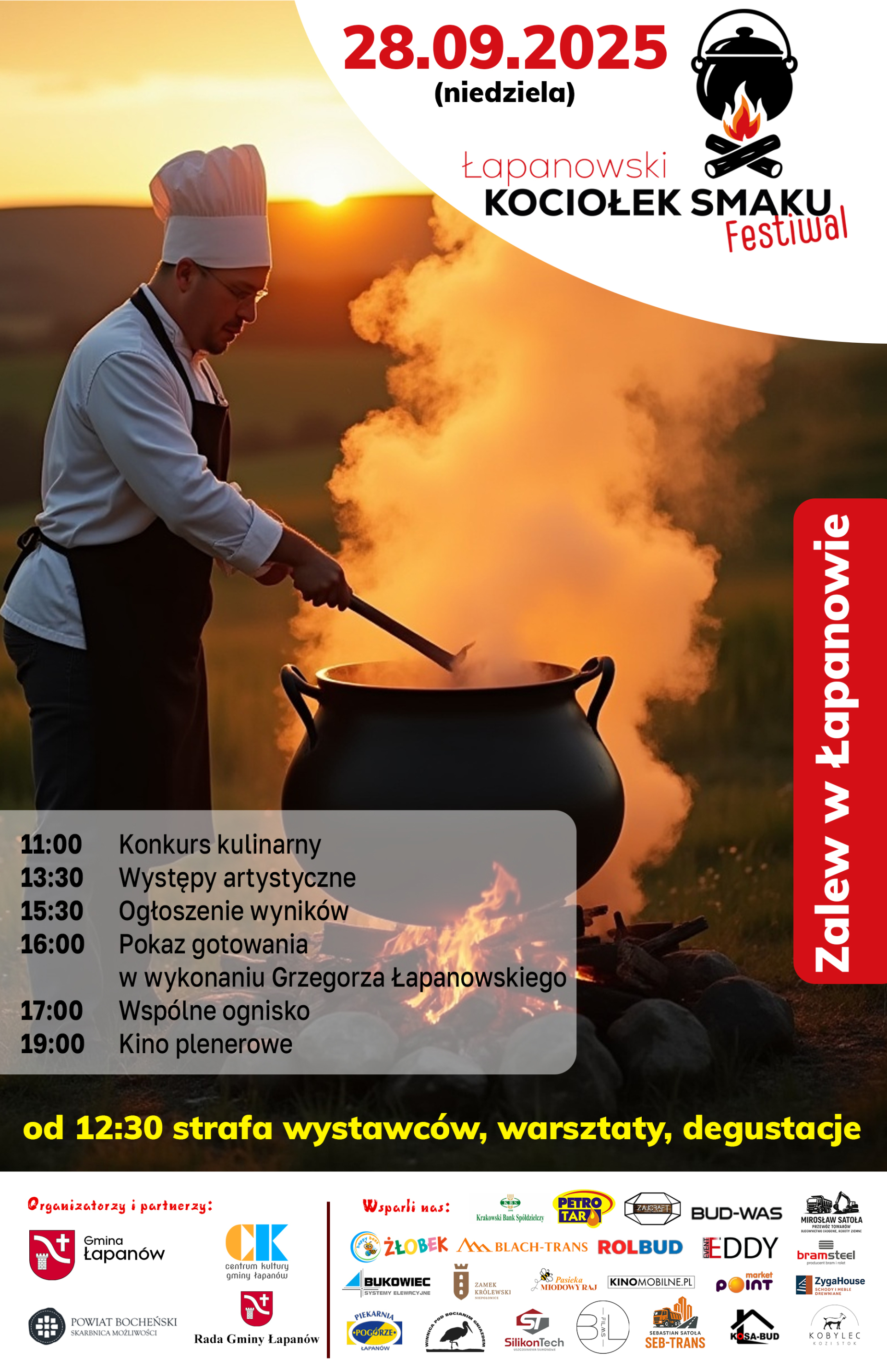 Festiwal „Łapanowski Kociołek Smaku” to wydarzenie, które łączy tradycję, smak i dobrą zabawę w wyjątkowej scenerii łapanowskiego zalewu. Organizatorami są Gmina Łapanów, Centrum Kultury Gminy Łapanów oraz Powiat Bocheński przy wsparciu partnerów i lokalnych instytucji.
