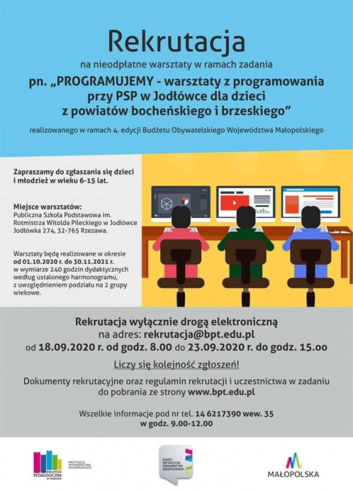 Szkoła Podstawowa w Jodłówce zaprasza na nieodpłatne warsztaty z programowania pn. "Programujemy - warsztaty z programowania przy PSP w Jodłówce dla dzieci z powiatu bocheńskiego i brzeskiego".