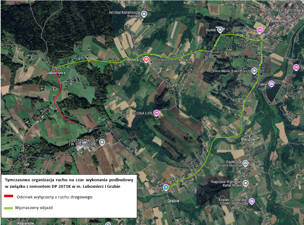 Objazd zamkniętego odcinka drogi wyznaczony został drogami powiatowymi przez Boczów, Wolicę, Łapanów i oznaczony kolorem zielonym na załączonej mapce.