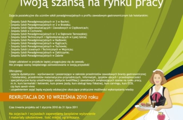 W Powiecie Bocheńskim w ramach projektu „Gastronomia i Hotelarstwo – Twoją szansą na rynku pracy” uczniowie Zespołu Szkół nr 3 w Bochni korzystają z zajęć z języka angielskiego, niemieckiego, matematyki, gastronomii, hotelarstwa oraz przedsiębiorczości. Ponadto wezmą udział w kursach zawodowych o kierunku „Kelner-barman”, „Sprzedawca z obsługą kasy fiskalnej” oraz w „Kursie komputerowym” przygotowującym do zdawania egzaminów ECDL. Wsparciem objęci są uczniowie uczący się w zawodzie: technik hotelarstwa, technik żywienia i gospodarstwa domowego oraz kucharz. Wszystkie zajęcia i kursy będą bezpłatne.